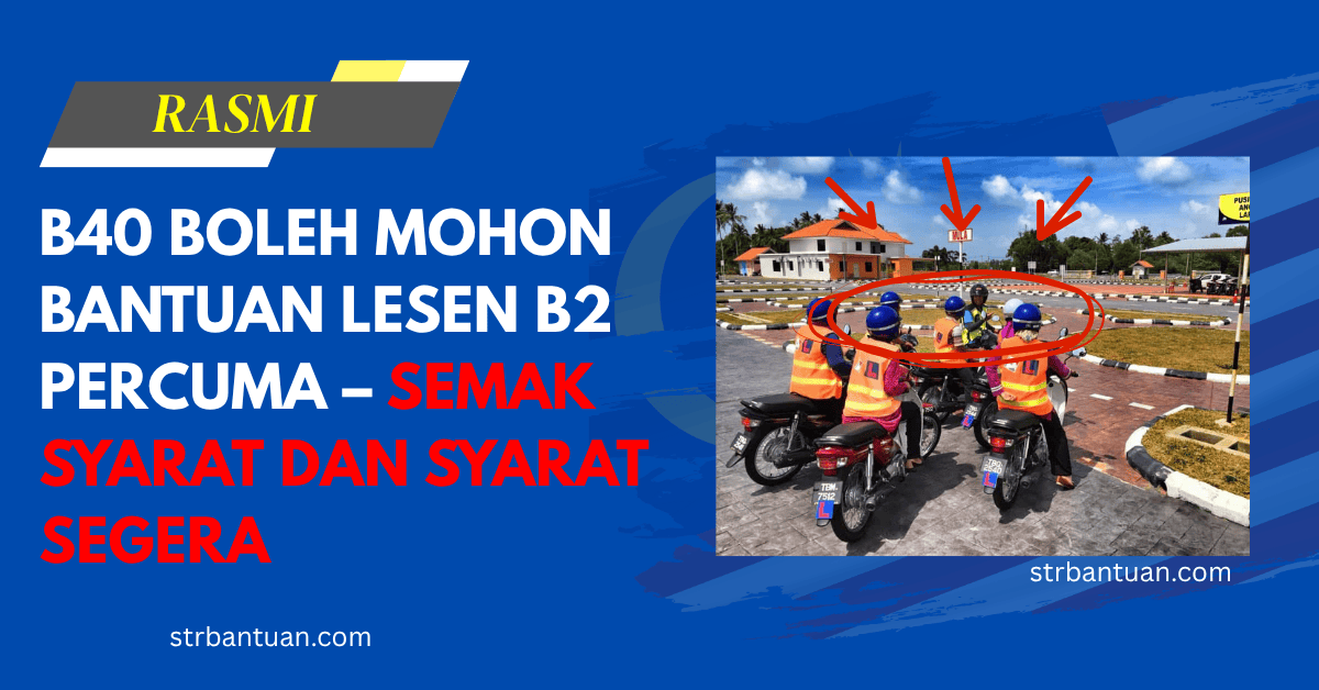Kerajaan melalui Jabatan Pengangkutan Jalan (JPJ) melaksanakan Program MyLesen B2 Tahun 2025 bagi membantu belia dan tanggungan keluarga B40 mendapatkan Lesen Memandu Malaysia (LMM) Kelas B2 (motosikal ≤250cc) secara PERCUMA (latihan & ujian ditanggung kerajaan).
