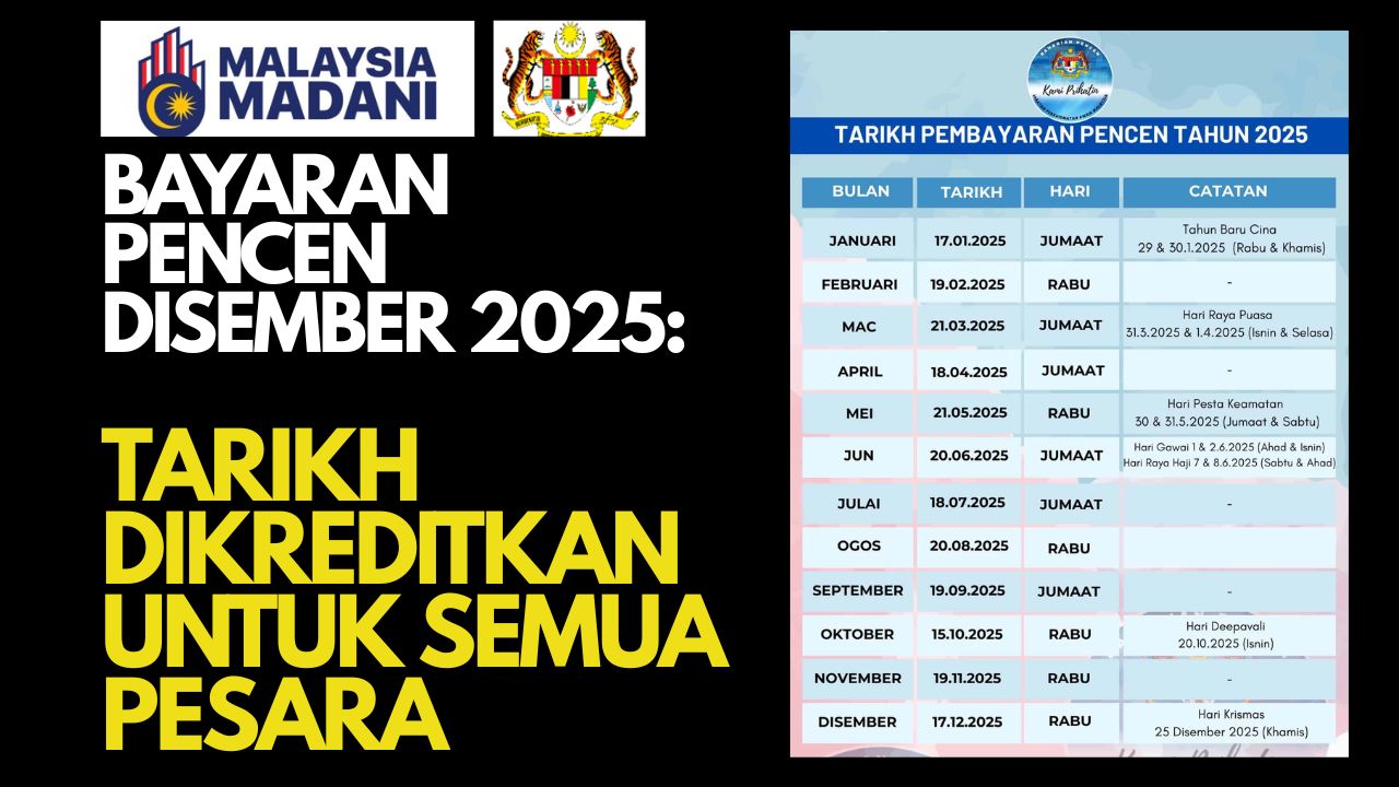 Bayaran pencen Disember 2025 akan dikreditkan pada 19 Disember 2025, lebih awal daripada tarikh biasa untuk memudahkan pesara membuat perancangan. Pastikan maklumat bank sentiasa dikemaskini dan semak status bayaran pada hari tersebut.