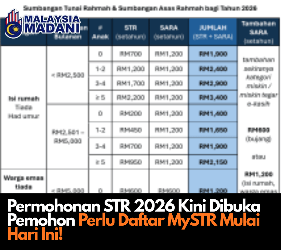Permohonan baharu dan kemaskini untuk STR 2026 dibuka mulai 13 Oktober 2025 dan dibuka sepanjang tahun mengikut fasa semakan.