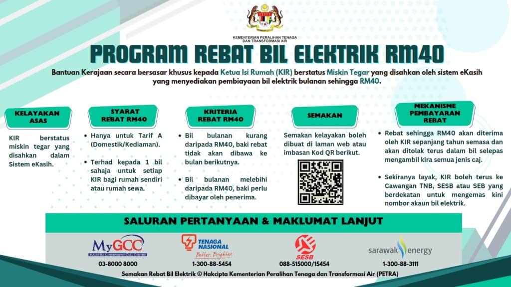 Program Rebat Bil Elektrik RM40 ialah bantuan bulanan Kerajaan yang membiayai sehingga RM40 bil elektrik rumah di bawah tarif domestik.